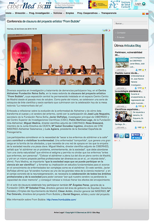 Diversos expertos en investigación y tratamiento de demencias participaron, en el Centro Alzheimer Fundación Reina Sofía, en la mesa redonda de clausura del proyecto artístico “From Bubble”, enfocada a reflexionar sobre la evolución de la enfermedad de Alzheimer y de cómo ésta transforma el cuerpo y el cerebro del enfermo, y cuya exposición central ha permanecido instalada en el espacio Centro Centro de Madrid. Como parte del mismo, se celebraron una serie de coloquios de tinte científico y socio sanitario que culminaron con la celebración hoy de la mesa redonda “La metamorfosis del yo”.