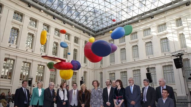 La alcaldesa de Madrid, Manuela Carmena, ha sido hoy la anfitriona de la Reina Sofía en la inauguración de la exposición «From Bubble» («Desde la Burbuja»), un proyecto artístico para concienciar sobre el alzhéimer cuya instalación central visitaron juntas en la sede municipal del Palacio de Cibeles.