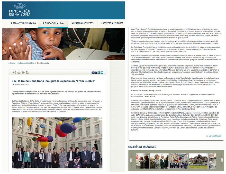 Su Majestad la Reina Doña Sofía, presidenta de Honor del proyecto artístico, ha inaugurado en el Palacio de Cibeles, “From Bubble”, una exposición que a través del arte reflexiona sobre la enfermedad de Alzheimer y la vida diaria de quienes la sufren.