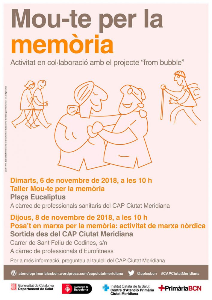 Los días 6 y 8 de noviembre, los profesionales del CAP Ciutat Meridiana organizan dos actividades en favor de la lucha contra el Alzheimer en colaboración con el proyecto From Bubble: el taller «Muévete por la memoria»  y la actividad de marcha nórdica «Ponte en marcha por la memoria».